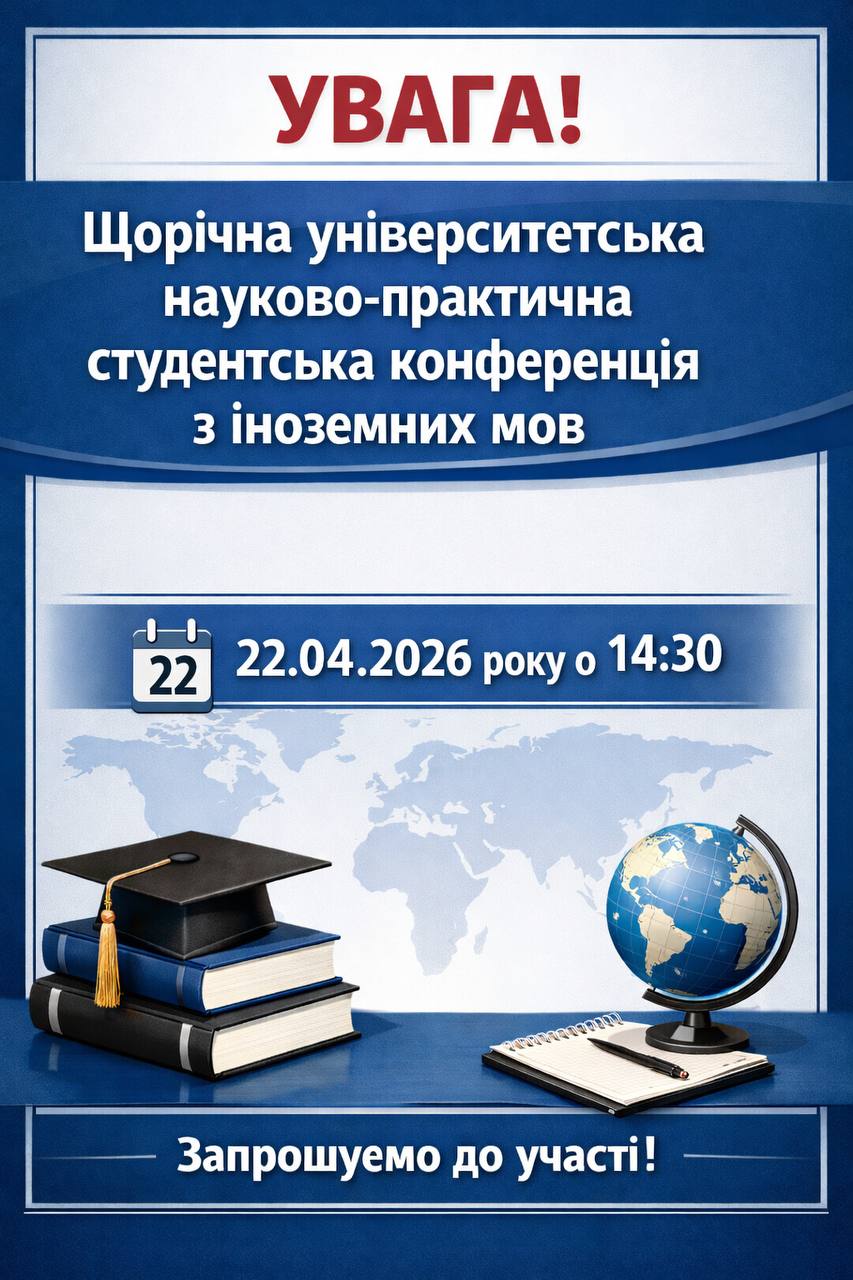 Запрошуємо студентів, аспірантів і викладачів до участі у щорічній університетській науково-практичній студентській конференції з іноземних мов, яка відбудеться онлайн 22 квітня 2026 року о 14:30.