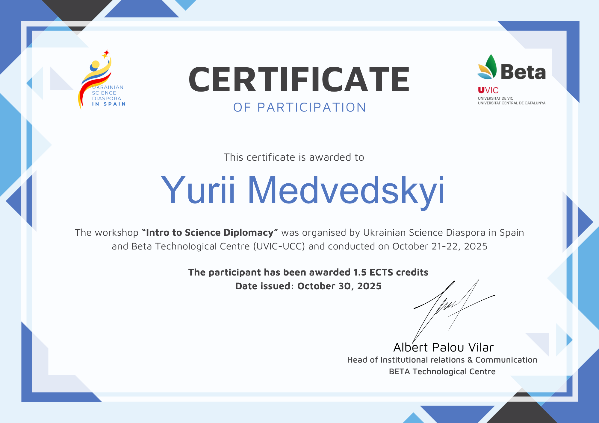 У 2013 році захистив дисертацію на здобуття наукового ступеня кандидата технічних наук за спеціальністю «Геодезія, фотограмметрія та картографія»