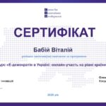 В 2020 році пройшов навчання за програмою «Е-демократія в Україні: онлайн участь на рівні країни та громад». Сертифікат про навчання Центру розвитку інновацій.