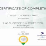 Курс підвищення кваліфікації у межах реалізації проєкту English4Ukraine Маріупольського державного університету за програмою ” Practical English New edition”, 90 академічних годин (3 кредити ЄКТС). Сертифікат від 25 червня 2025 року