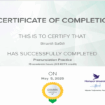 Курс підвищення кваліфікації у межах реалізації проєкту English4Ukraine Маріупольського державного університету за програмою “Pronunciation Practice”, 15 академічних годин (0,5 кредиту ЄКТС). Сертифікат від 5 травня 2025 року