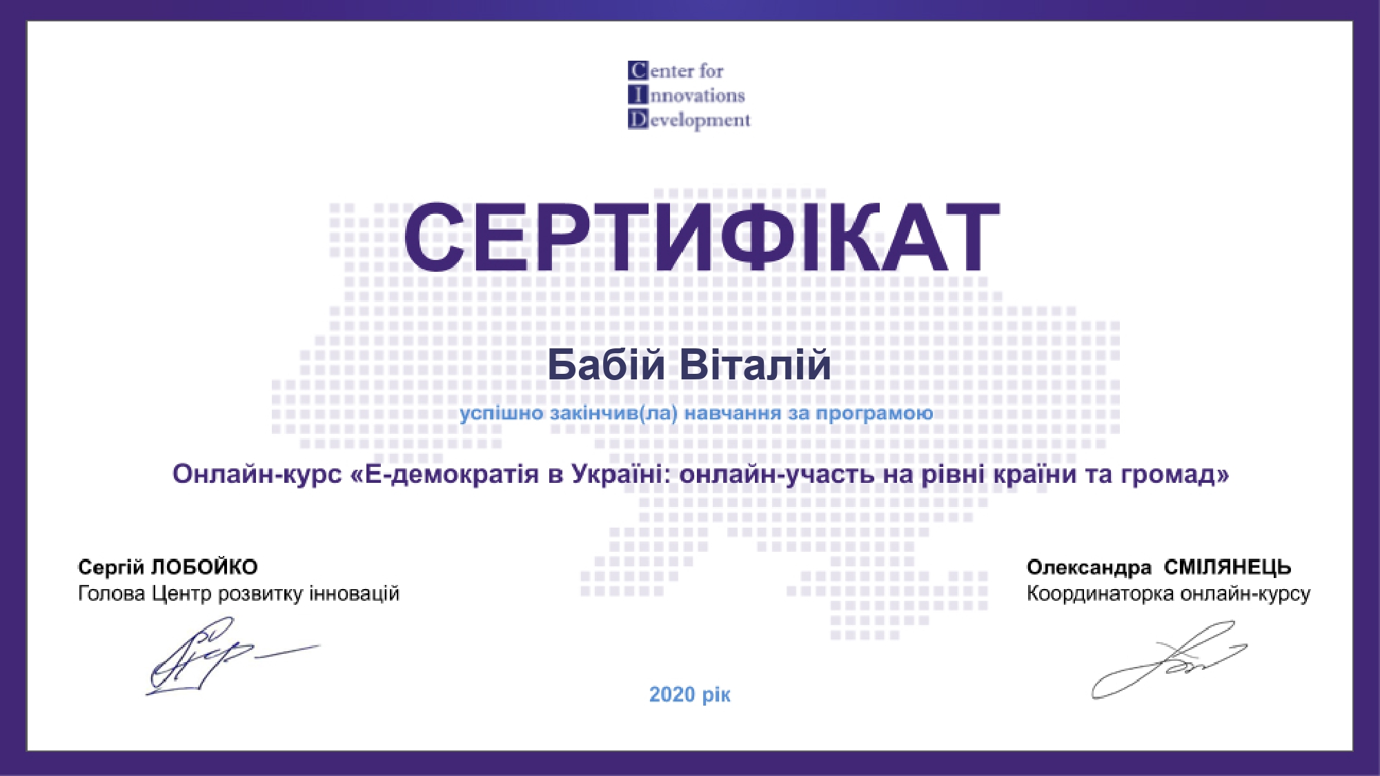 В 2020 році пройшов навчання за програмою «Е-демократія в Україні: онлайн участь на рівні країни та громад». Сертифікат про навчання Центру розвитку інновацій.