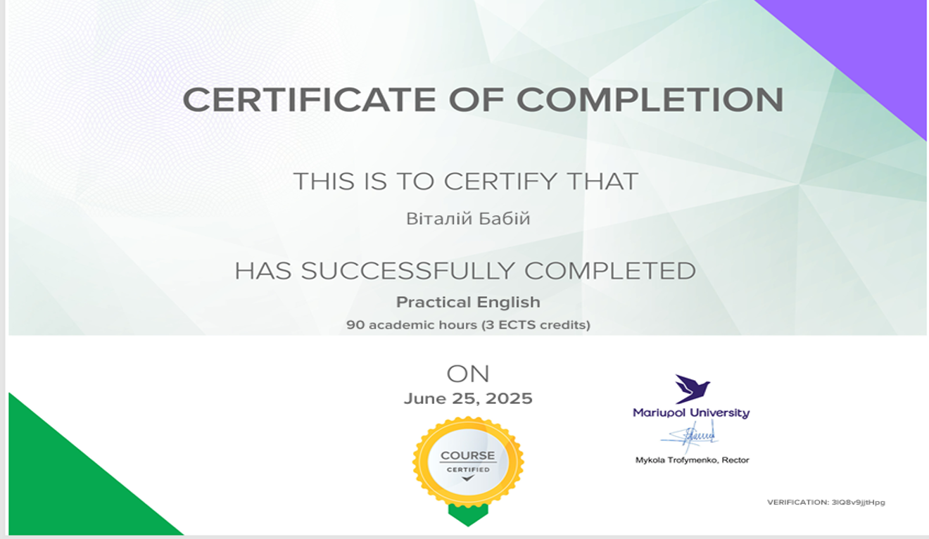 Курс підвищення кваліфікації у межах реалізації проєкту English4Ukraine Маріупольського державного університету за програмою ” Practical English New edition”, 90 академічних годин (3 кредити ЄКТС). Сертифікат від 25 червня 2025 року