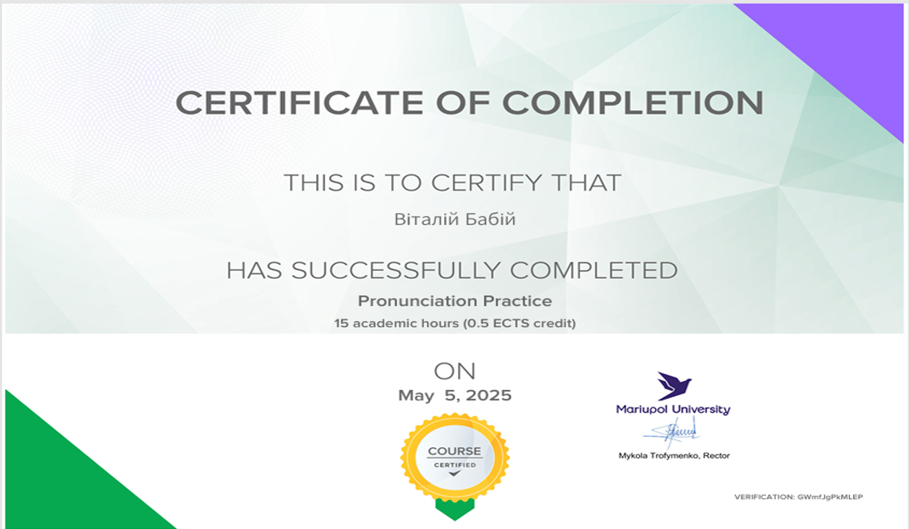 Курс підвищення кваліфікації у межах реалізації проєкту English4Ukraine Маріупольського державного університету за програмою “Pronunciation Practice”, 15 академічних годин (0,5 кредиту ЄКТС). Сертифікат від 5 травня 2025 року