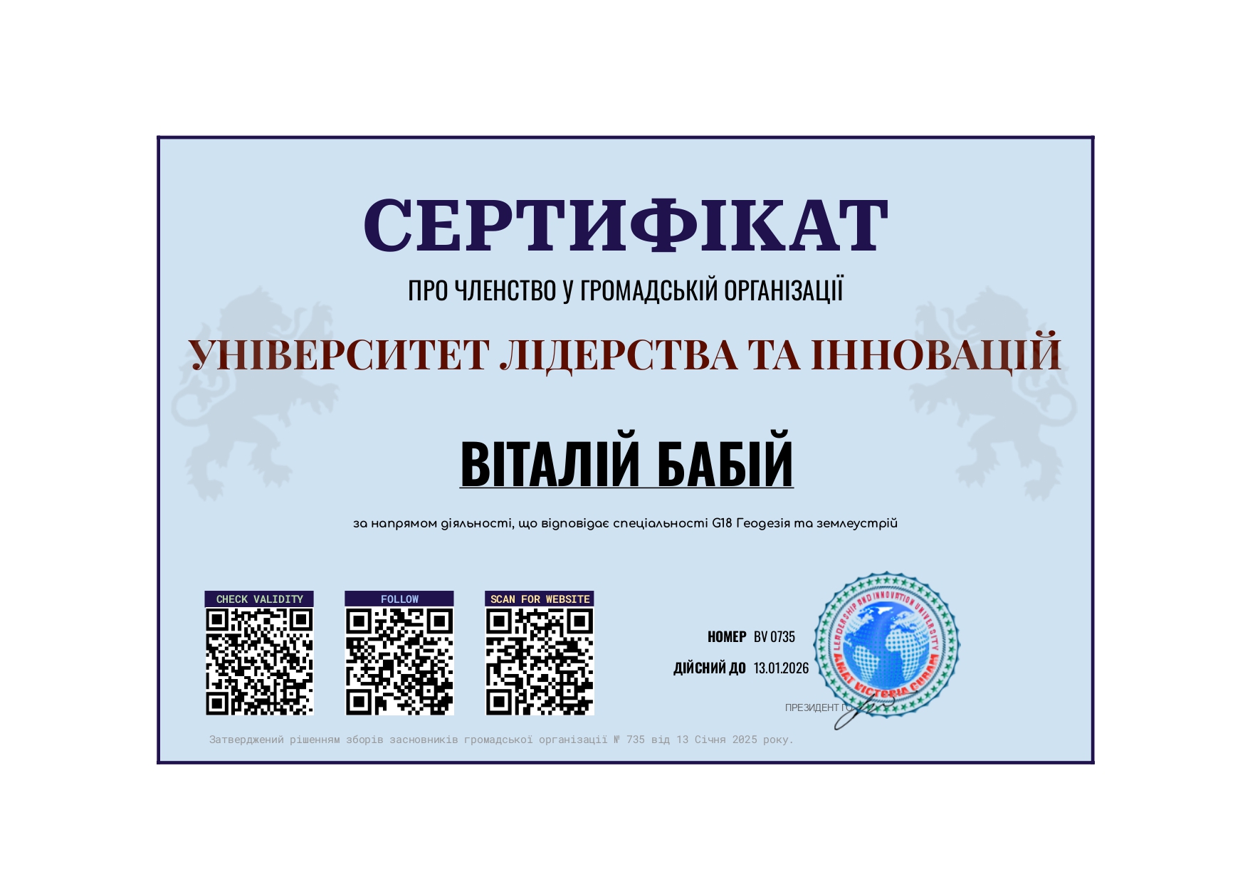 - Бабій В.В. Перспективи використання БПЛА для потреб картографії та кадастру в післявоєнний період. Наукова конференція професорсько-викладацького складу, аспірантів, студентів та співробітників відокремлених структурних підрозділів університету. – Київ: НТУ, 2023, Вип. 79, с. 283-284. DOI: 10.33744/2786-6459-2023-79