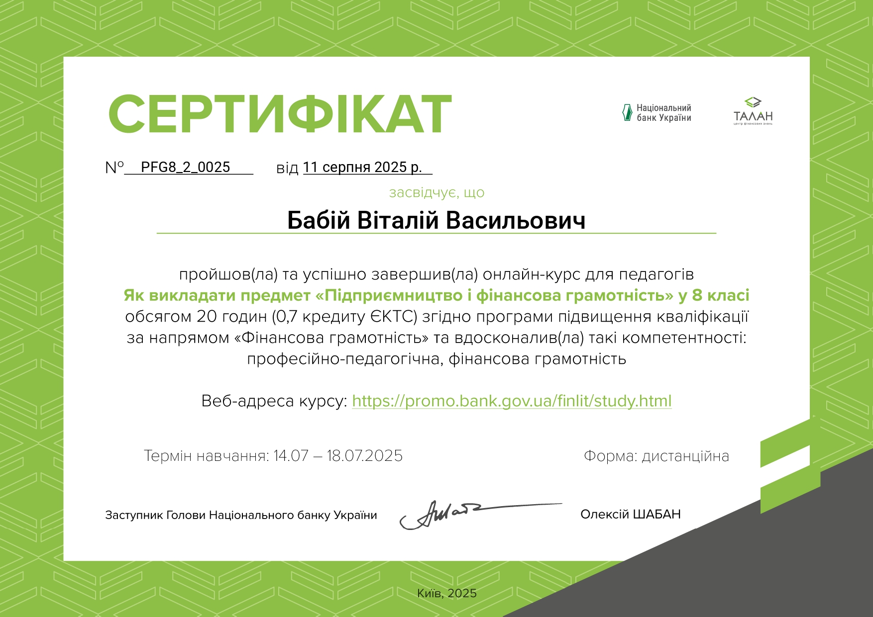 Програма підвищення кваліфікації за напрямом “Фінансова грамотність” для педагогів: “Як викладати предмет “Підприємництво і фінансова грамотність” у 8 класі” обсягом 20 годин (0,7 кредиту ЄКТС), вдосконалив такі компетентності: професійно-педагогічна, фінансова грамотність. Сертифікат PFG8_2_0025 від 11 серпня 2025 р.