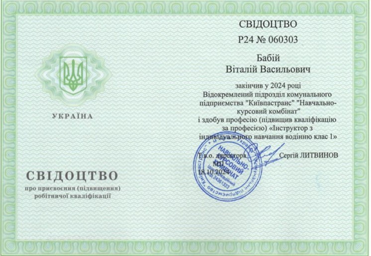 Підвищив кваліфікацію за професією “Інструктор з індивідуального навчання водінню клас 1”. Відокремлений підрозділ комунального підприємства “Київпастранс” “Навчально-курсовий комбінат”. Свідоцтво про присвоєння (підвищення) робітничої кваліфікації Р24 №060303 від 18 жовтня 2024 р