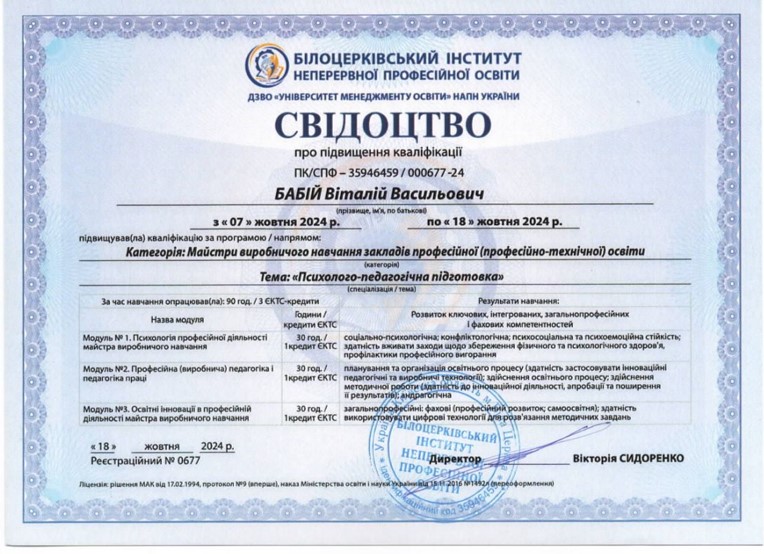 Курс підвищення кваліфікації за темою “Психолого-педагогічна підготовка” категорії Майстри виробничого навчання закладів професійної (професійно-технічної) освіти. ДЗВО “Університет менеджменту освіти” НАПН України. Свідоцтво про підвищення кваліфікації ПК/СПФ-35946459/000677-24 від 18 жовтня 2024 року