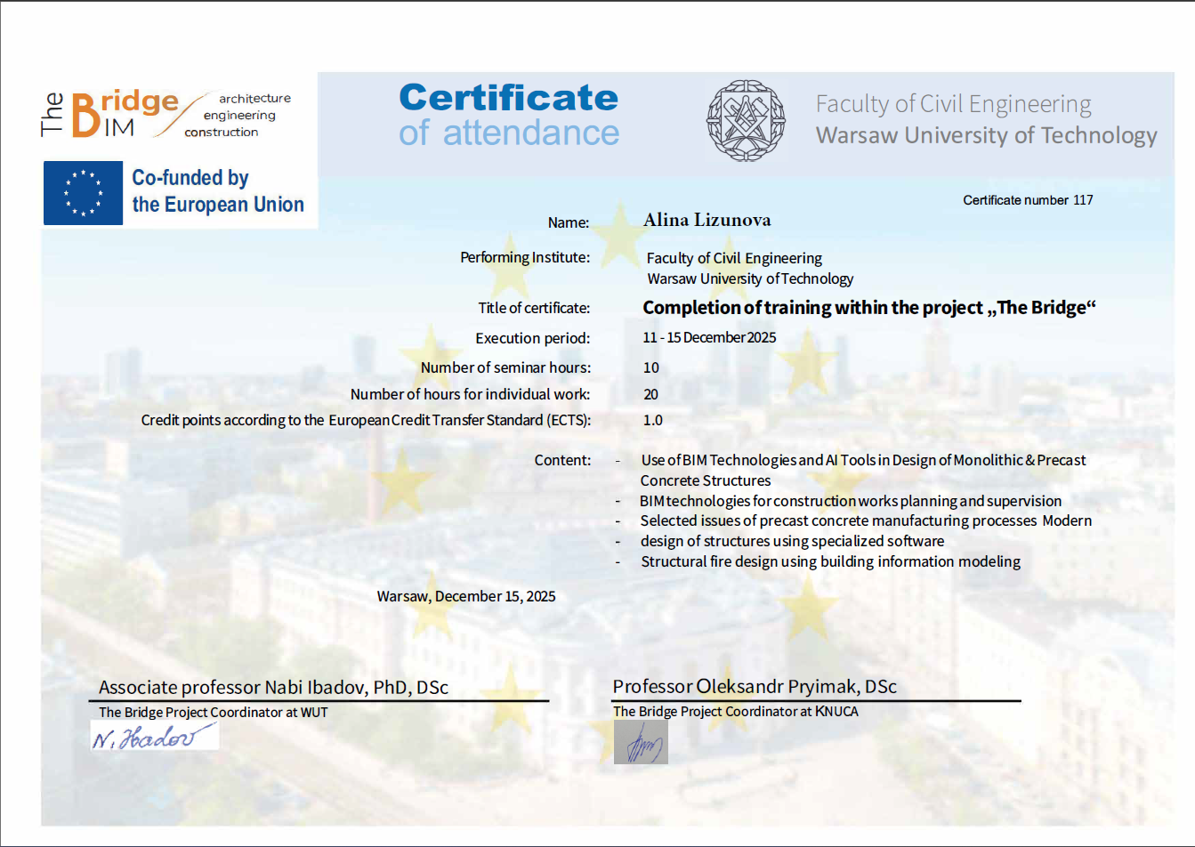 4. Титаренко М. BIM у будівельному виробництві / М. Титаренко, А. Лізунова // Build-Master-Class-2024 : International scientific–practical conferenceof young scientists, Kyiv, 05-07 november 2024 / Kyiv national university of construction and architecture (KNUCA); chief editor: V. I. Skochko. – Kyiv : KNUCA, 2024. – С. 131 – 132. – Бібліогр. : 11 назв. https://repositary.knuba.edu.ua/items/abca1a30-1a98-481a-ab37-7e6b7851670b
