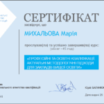 - Technische Hochschule Lübeck (Germany), Certificate N UDB22/49 from December 21, 2022 International program of advanced training «Creation of a modern electronic course on the MOODLE platform», 14.11.2022 – 21.12.2022, 60 hours (2 ECTS).