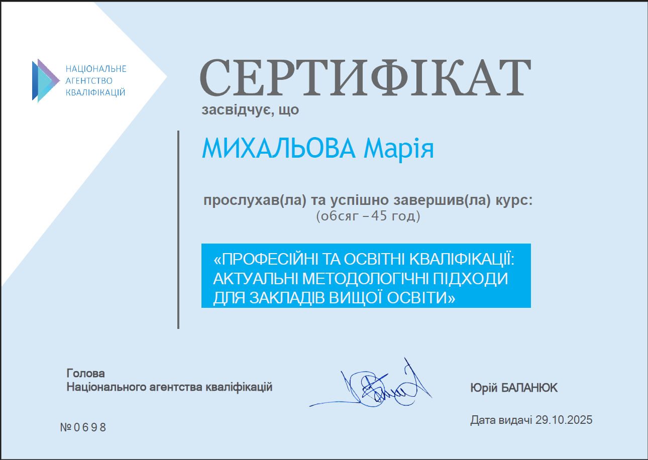 - Technische Hochschule Lübeck (Germany), Certificate N UDB22/49 from December 21, 2022 International program of advanced training «Creation of a modern electronic course on the MOODLE platform», 14.11.2022 – 21.12.2022, 60 hours (2 ECTS).